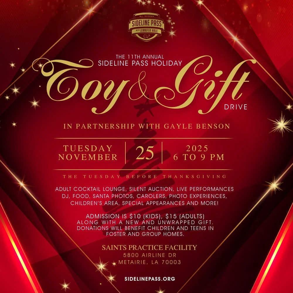 Join Sideline Pass on Tuesday, November 25, 2025, at 6:00 PM for our 11th Annual Holiday Toy & Gift Drive, benefiting children in shelters and group foster homes across South Louisiana.
